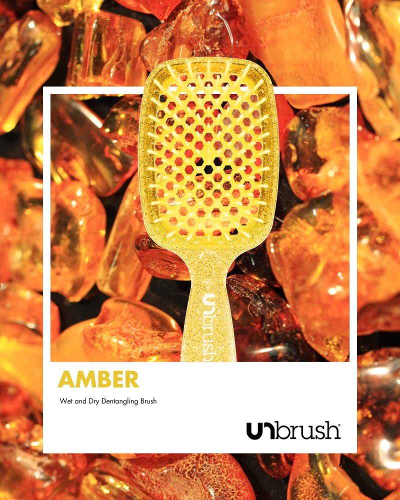 UNbrush® - Amber gently yet thoroughly extracts knots and tangles from even the most unruly hair, painlessly and effortlessly. Featuring the perfect blend of 105 dual length bristles, combined with an ultralight high performance handle, UNbrush® helps reduce styling time and prevents hair from catching. Great for wet or dry hair.