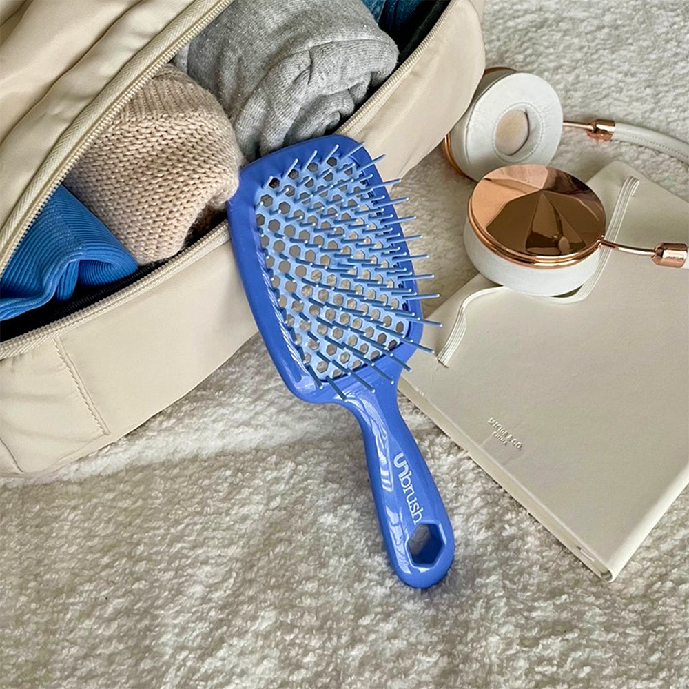 UNbrush® - Iris gently yet thoroughly extracts knots and tangles from even the most unruly hair, painlessly and effortlessly. Featuring the perfect blend of 105 dual length bristles, combined with an ultralight high performance handle, UNbrush® helps reduce styling time and prevents hair from catching. Great for wet or dry hair.