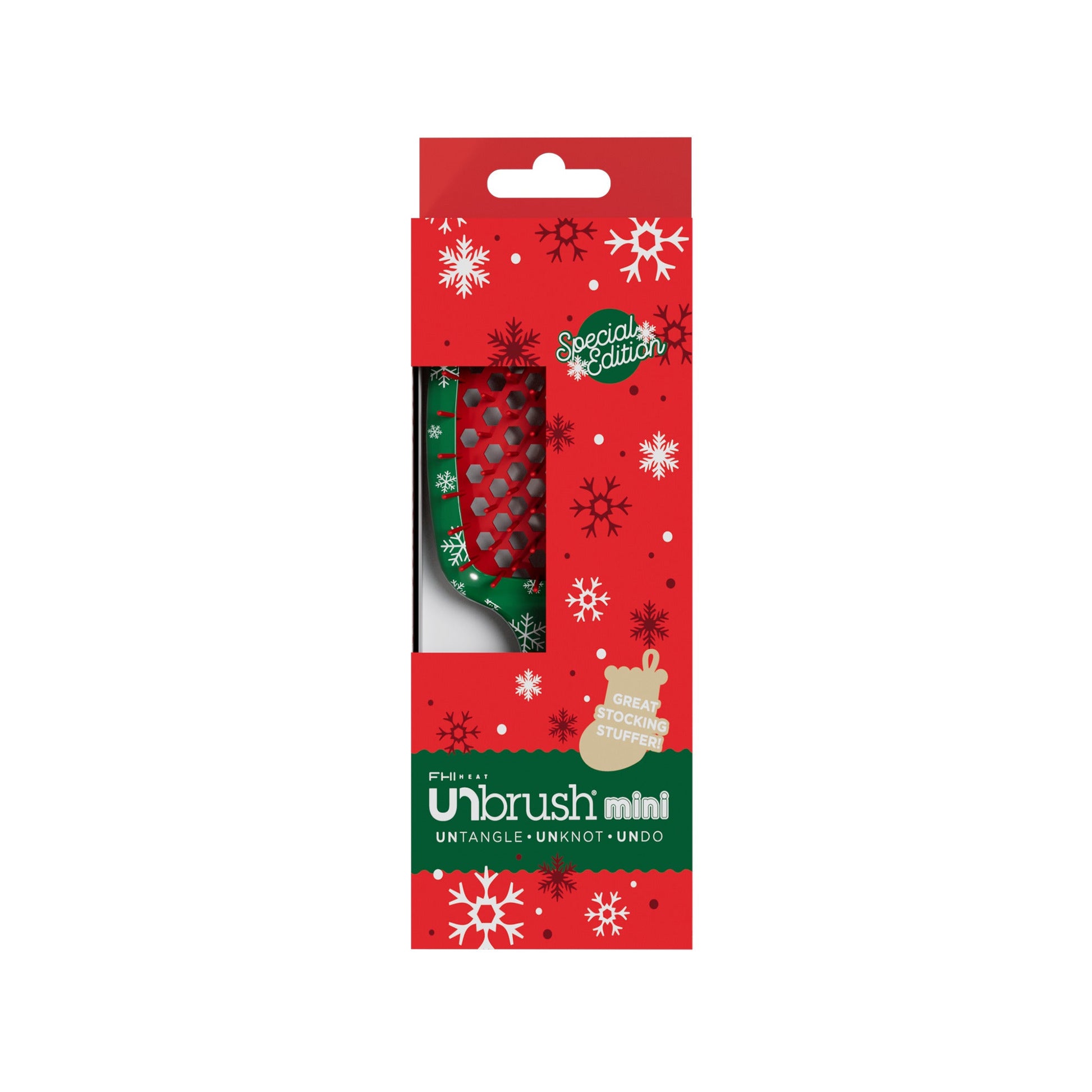 UNbrush® Mini - Snowy Pine Snowflakes Green is the go to travel companion! The perfect blend of dual length bristles, combined with an ultralight mini handle, UNbrush® Mini painlessly and effortlessly extracts knots and tangles from even the most unruly hair. Its compact size makes it great for travel!
