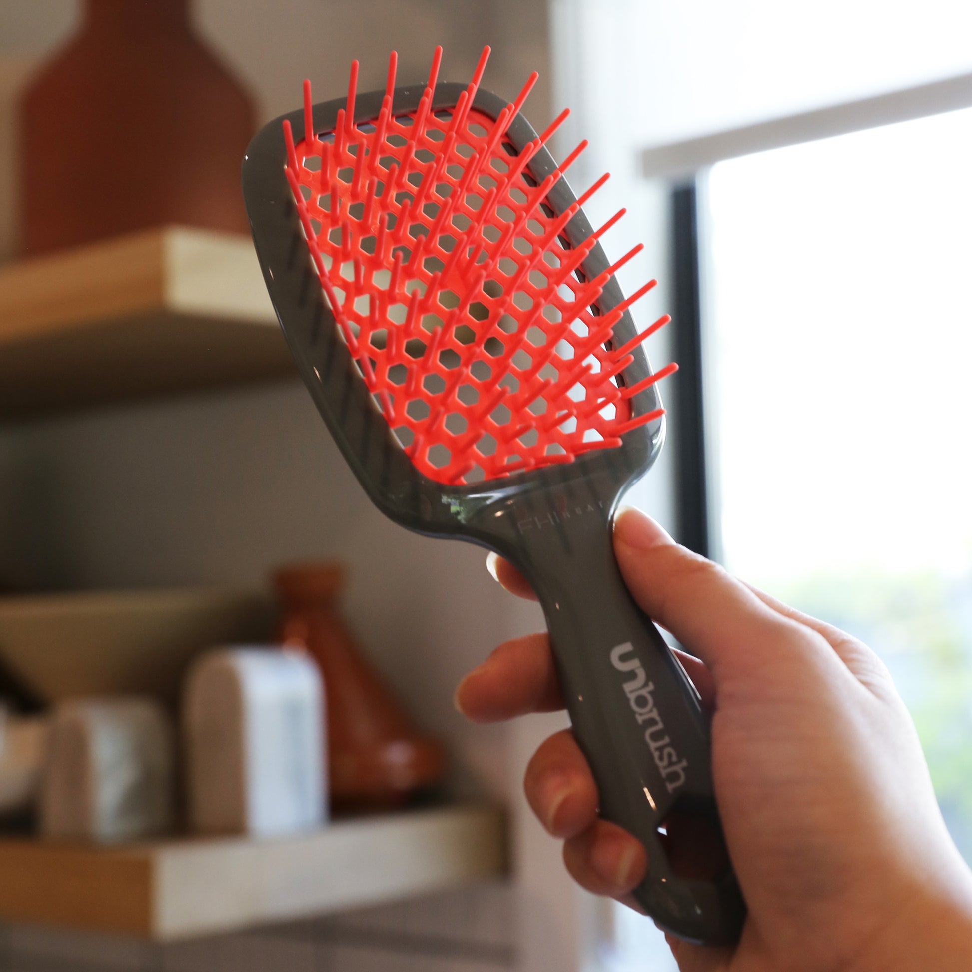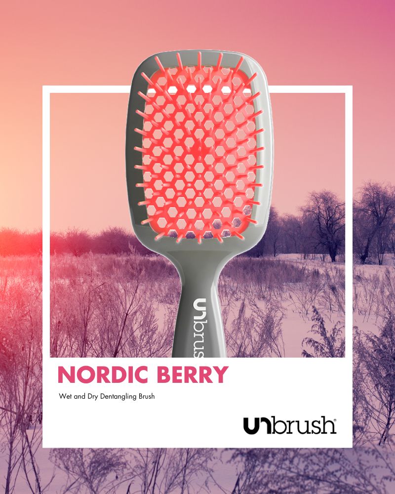 UNbrush - Nordic Berry Pink gently yet thoroughly extracts knots and tangles from even the most unruly hair, painlessly and effortlessly. Unique vented cushion reduces blowdry time by 48%! Prevents hair from catching. Works equally great on wet or dry hair.