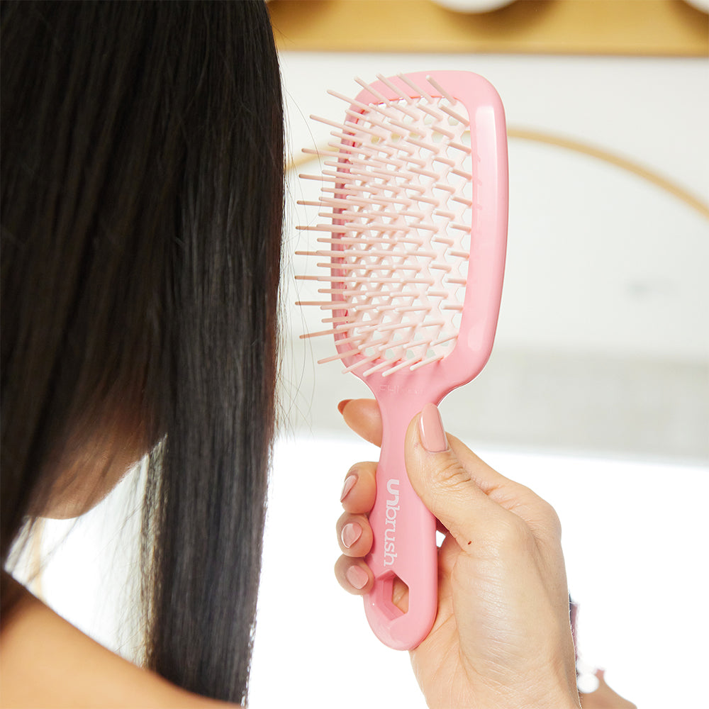 UNbrush® - Rose gently yet thoroughly extracts knots and tangles from even the most unruly hair, painlessly and effortlessly. Featuring the perfect blend of 105 dual length bristles, combined with an ultralight high performance handle, UNbrush® helps reduce styling time and prevents hair from catching. Great for wet or dry hair.